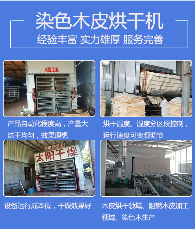 臨朐太陽干燥設備有限公司是生產木皮烘干機、阻燃木皮烘干機、染色木皮烘干機的企業,產品自動化程度高,產量大,烘干均勻,效果理想。設備有人工進板和自動進板兩種,烘干溫度、濕度分區段控制,運行速度可變頻調節,設備可人工出板和自動出板,用戶可根據情況自由選擇。